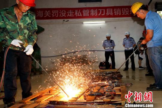 8月3日上午,廣州海關召開集中銷毀走私管制刀具新聞發布會。發布會結束後839件走私管制刀具被集中銷毀,其中涉及軍刀、彈簧刀、尼泊爾彎刀、佩劍、砍刀等多個品種。