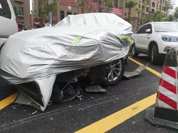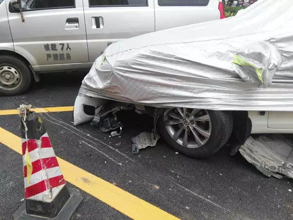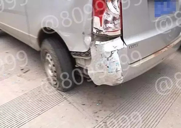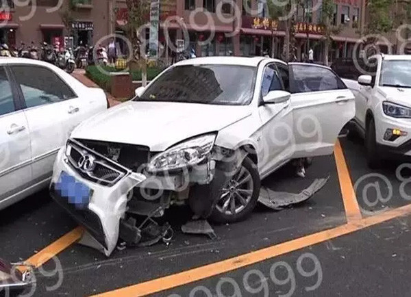 剛從車庫出來,他就撞上了車庫裡的警示標志;然後他將車開到小區旁的逸華路上,連撞了4輛停在路邊泊位上的汽車。之後他還淡定地掛了個倒檔駕車離開了現場,隨後又撞壞了路邊的3輛車。
