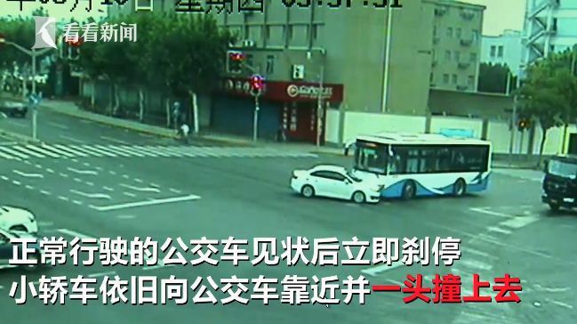 監控顯示,10號清晨6點不到,龍吳路龍耀路路口,一輛小轎車突然以低速闖燈通過路口,正常行駛的公交車見狀後立即剎停。沒想到小轎車依舊以低速向停著的公交車不斷靠近,最終一頭撞了上去。事故發生後,公交車司機和售票員趕緊下車查看對方是否受傷,這纔發現轎車駕駛員竟然睡著了。