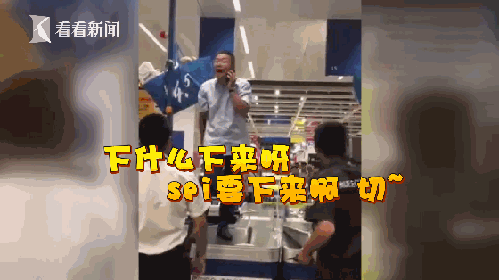 視頻裡該男子站在收銀臺上各種撒潑,工作人員勸說他下來的時候:『下什麼下來呀,sei要下來啊,切~』