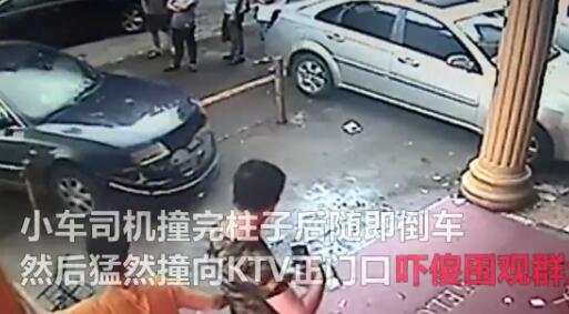 隨後該名男子又回到車上啟動車輛,車輛再次失控撞上了KTV的大門。