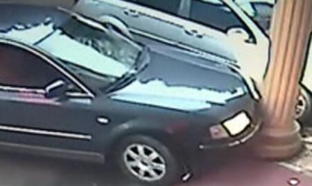 監控視頻顯示,早上6點08分,一輛黑色小車突然失控撞上了KTV門口的門柱上。事發時被撞的柱子,柱子柱體出現開裂,柱子頂端也發生了位移。